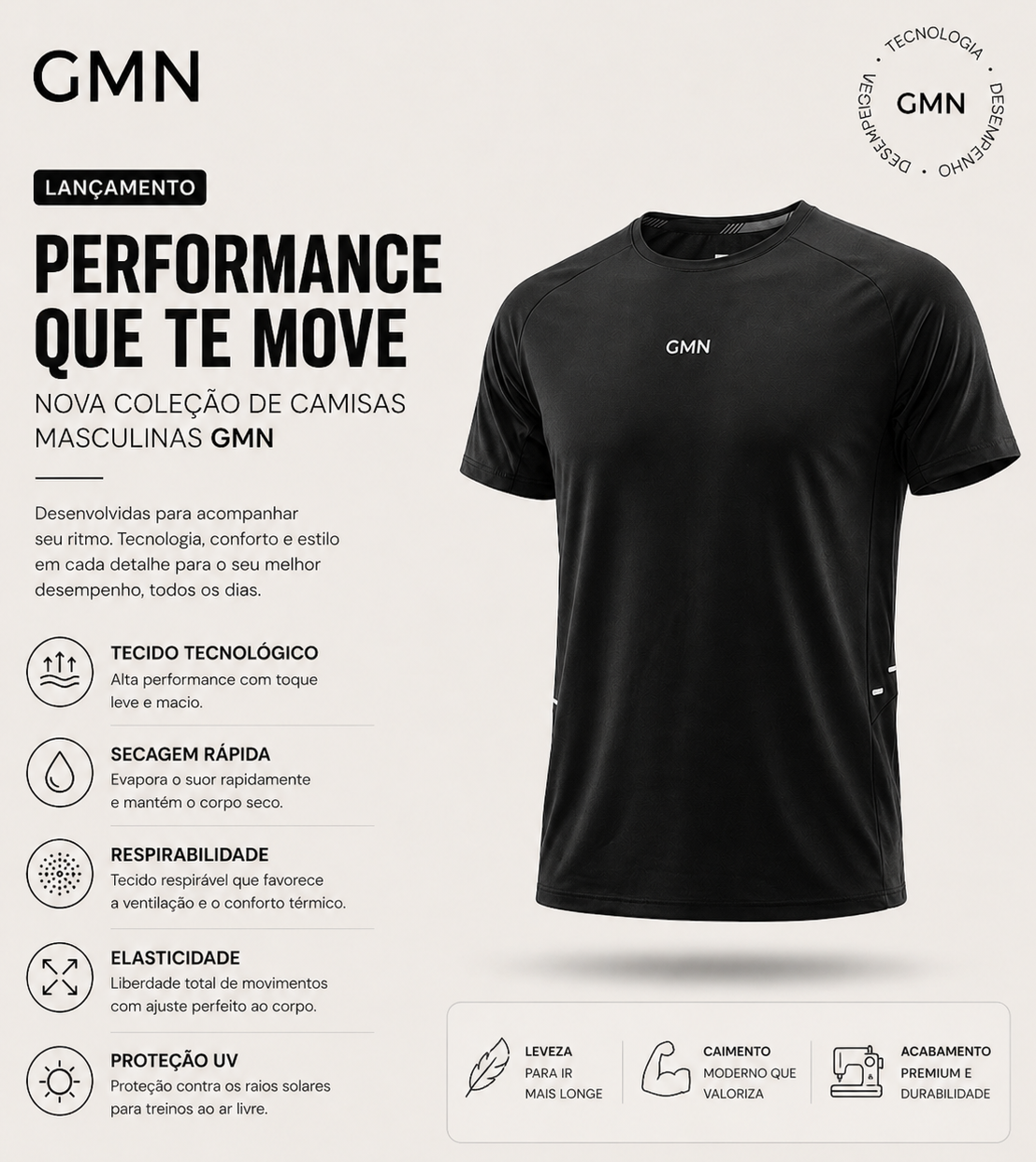 Nossas peças são desenvolvidas com tecidos de alta elasticidade e modelagem ajustada ao corpo, proporcionando conforto e adaptação a diferentes biotipos.